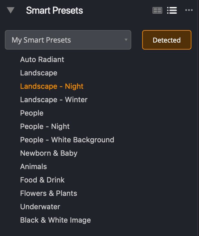 Die folgenden Smart Presets werden durch die Szenenerkennung gesteuert. Diese Kategorien sind darauf trainiert, eine breite Palette von Fotos zu erkennen. Unsere Tests der KI-Szenenerkennung ergaben eine Trefferquote von 96 Prozent. Beachten Sie, dass einige Bilder in mehrere Kategorien gehören könnten – die gewählte Kategorie basiert auf einem abgestuften System, um sicherzustellen, dass wir keine Fotos beschädigen.