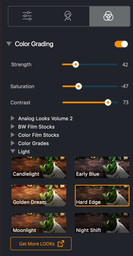 - Wählen Sie einen LOOK aus und passen Sie es mit den Schiebereglern Intensität, Sättigung und Kontrast nach Ihrem Geschmack an. Diese drei Regler sind SEHR variabel.