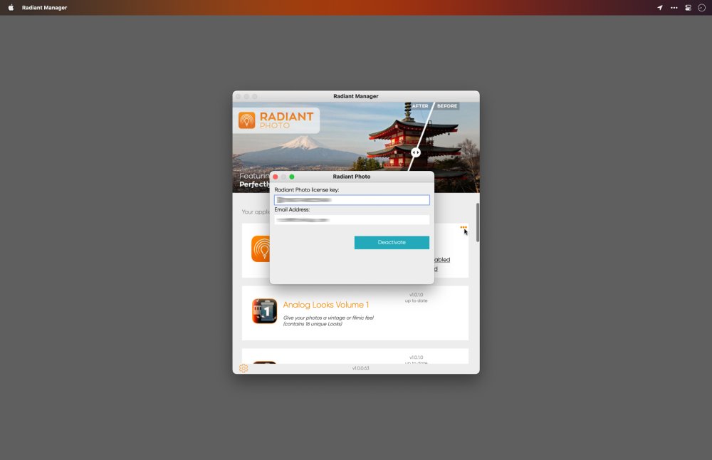 Wenn Sie Radiant Photo einmal von einem Computer entfernen müssen, sollten Sie es deaktivieren. Die Deaktivierung ermöglicht es Ihnen, Radiant Photo von einem Computer zu entfernen, um es auf einem anderen Computer zu verwenden. Denken Sie daran, dass Sie Radiant Photo auf zwei Computern gleichzeitig installieren und verwenden können. Wenn Sie Radiant Photo also nur auf zwei Computern verwenden, brauchen Sie es nicht zu deaktivieren.