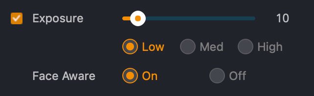 Dies ist nützlich, um Ihre Fotos bei der Stapelverarbeitung oder bei der Anwendung von Voreinstellungen fein abzustimmen. Wenn Sie z. B. hellere Fotos wünschen, wählen Sie Hoch. Aus diesem Grund werden Sie beim Laden verschiedener Fotos einen unterschiedlichen Belichtungswert bemerken. Wenn Sie eine Änderung vornehmen möchten, können Sie den Schieberegler Belichtung manuell anpassen.