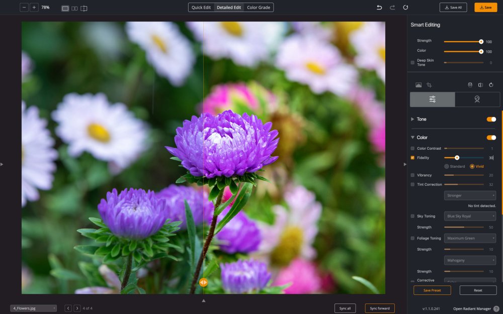 Satte Violett- und Blautöne in Ihrem Bild sind aufgrund der Funktionsweise der Kamerasensoren oft verblasst oder verzerrt. Aktivieren Sie die Option Farbtreue, um das gesamte Farbspektrum der Farben, die die Kamera nicht erfasst hat, neu zuzuordnen. Die digitale Farbtreue wandelt die von der Kamera erzeugten unechten Farben in die echten Farben um, die das menschliche Auge zum Zeitpunkt der Aufnahme des Fotos gesehen hat.