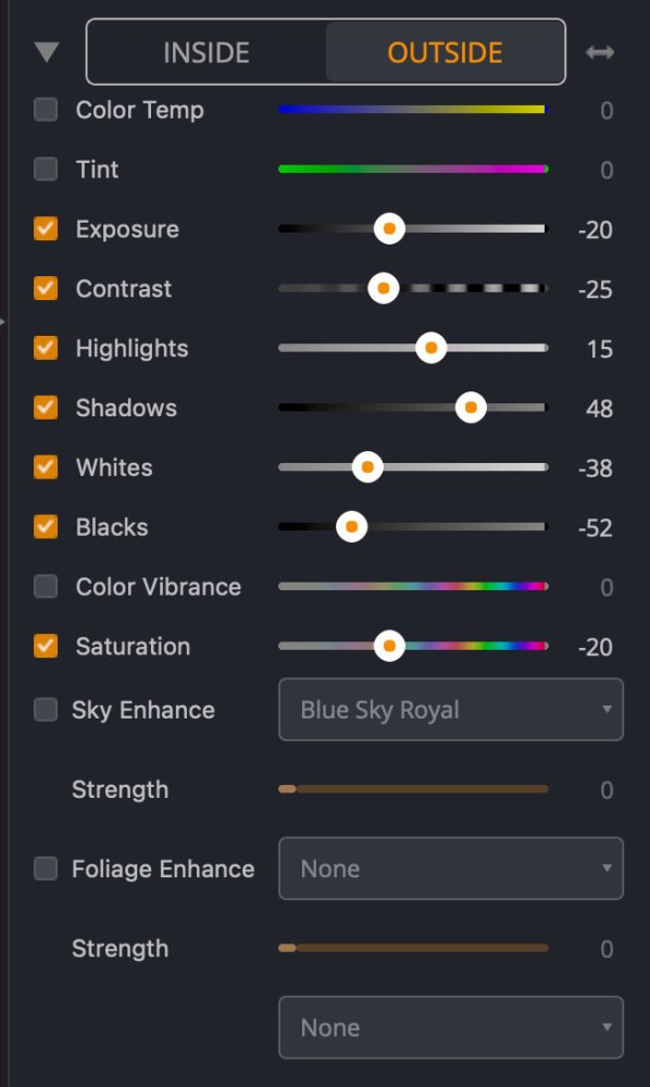 Für jede dieser Verlaufsarten können Sie zwei Arten von Korrekturen festlegen: Innen und Außen für radiale Verläufe und Oben und Unten für lineare Verläufe. Diese beiden Einstellungen werden am unteren Rand des Verlaufsfilter-Werkzeugs als Buttons angezeigt. Klicken Sie auf das Pfeil-Symbol, öffnet sich jeweils ein Drop-Down-Menü mit den Einstellungsmöglichkeiten.