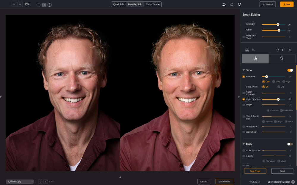 Probieren Sie die Einstellung Lichtstreuung aus, wenn Sie ein weicheres Licht in Ihrem Foto wünschen. Diese Einstellung eignet sich besonders gut für Porträtfotos, wird aber von vielen Nutzern auch für andere Bilder bevorzugt. Sie mildert die Unreinheiten im Gesicht und erzeugt ein diffuses, weicheres Bild mit weniger Kontrast. Wenn dieser Algorithmus aktiviert ist, sind die Hauttöne oft etwas wärmer oder rötlich. Alle Fotografen können jedoch die weiche und subtile Verbesserung genießen, die dieser Algorithmus bewirkt. Stellen Sie sicher, dass Sie die Anpassung mit dem Schieberegler verfeinern, um die Stärke des Effekts zu kontrollieren.