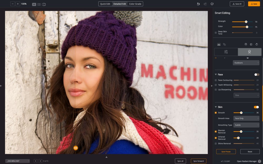 In diesem Arbeitsbereich finden Sie vier unterschiedliche Bearbeitungskategorien, die speziell für die Optimierung von Porträtaufnahmen entwickelt wurden. Wenn Sie Radiant Photo ausführen, wird Ihr Bild genau analysiert, um Geschlecht, Herkunft, Alter und andere Merkmale jedes Gesichts zu bestimmen. Diese Analyse hilft dabei, je nach Hauttyp und Gesichtform automatische Verbesserungen vorzunehmen.