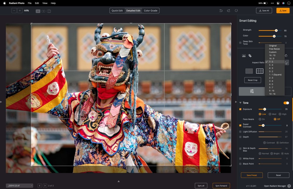 Mit dem Zuschneidewerkzeug können Sie Bilder in Radiant Photo zuschneiden. Die Funktion “Zuschneiden” ist im Photoshop-Plug-in nicht verfügbar.