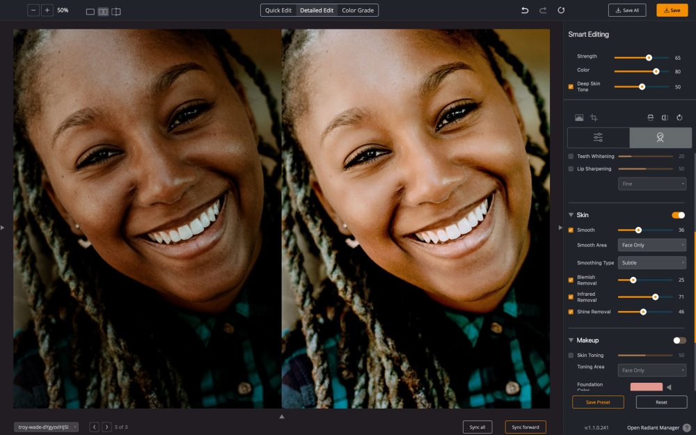 Wenn Ihre fotografierte Person Hautunreinheiten oder Akne hat, kann der Schieberegler zur Entfernung von Hautunreinheiten automatisch gezielte Verbesserungen vornehmen. Radiant Photo scannt den Hautbereich auf Unvollkommenheiten und führt eine lokalisierte Korrektur durch, die die umliegenden Hautbereiche nicht beeinträchtigt.