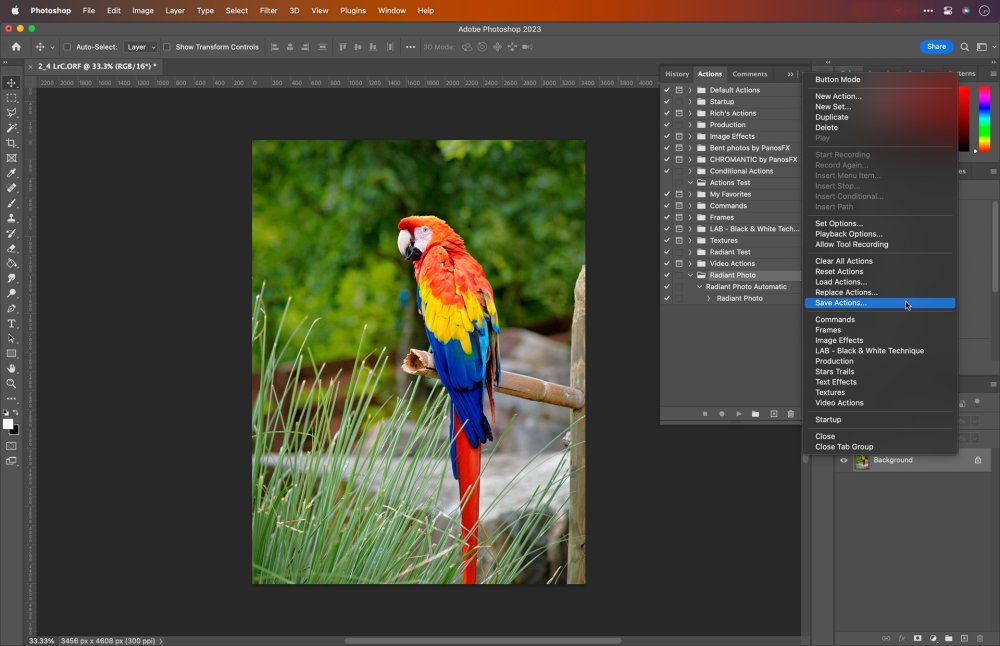 - Then click the three bars in the upper right corner of the panel. This button is called the panel submenu. Choose Save Actions, and then save your settings on your hard drive to back it up.