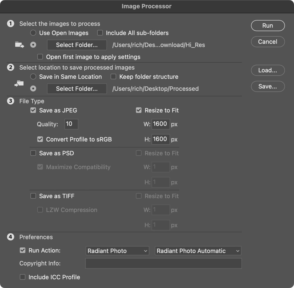 - Be sure to look over the Image Processor window one more time from top to bottom. When ready, click the Run button. Photoshop will now process each image that you selected and create a new version with Radiant Photo 2 applied. You’ll find the resulting images in the folder you’ve chosen.