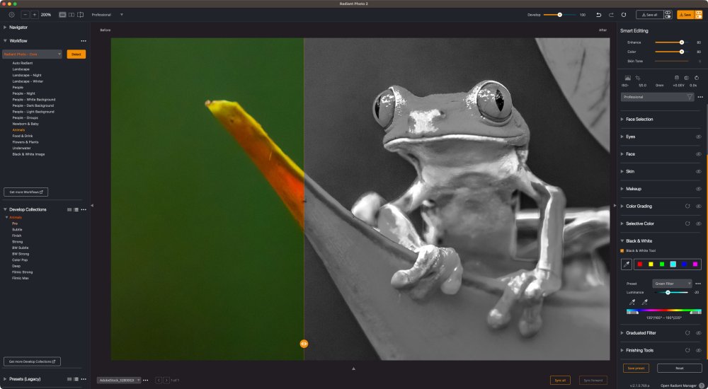 Want a hit of color for effect? Flip on Partial Color and leave one (or more) hues behind with subtle feathering. You’ll also find a preset menu that mimics classic lens filters (e.g., red filter for dramatic skies) and a great workflow: selective tweaks in color first (Selective Color), then convert to B&W for maximum control.