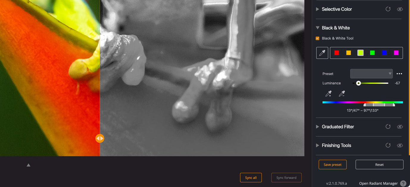 Most B&W tools lock you into six or eight color targets. Ours uses a zone-based approach with reassignable samples and featherable ranges. If your image doesn’t contain “red,” reassign that zone to a hue that does exist and target it precisely. The range handles control coverage; the outer handles control feathering. Translation: smooth, halo-free transitions and clean edges without painting masks.