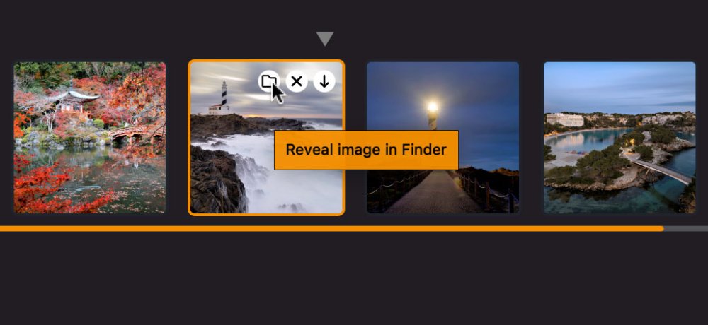 You can now mouse over items in the filmstrip. The Folder icon reveals the file on disk. The Ⅹ icon closes the file without changing. The ⬇ arrow icon saves the selected file. This should make it easier to load up a bunch of photos to work with and save as you go.