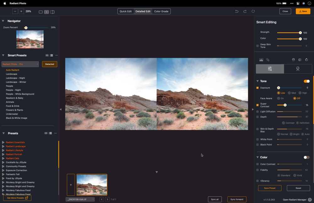 You can toggle between the before and Radiant Photo 2 image to see how your image has been improved. To do this, just click anywhere on the preview photo, or you can press and hold the spacebar.