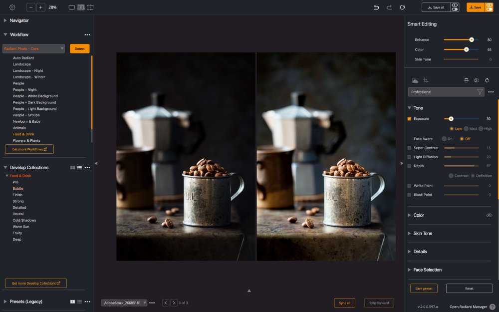 The Enhance control affects the tone and contrast of the image. It can handle tasks like highlight recovery and backlit photos. It can also improve the clarity and sharpness of a photo. Faces are more lifelike with contour, depth, and accurate tone.