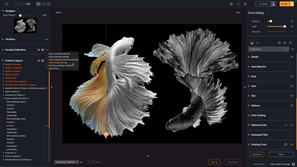- The develop settings provided by Radiant Photo cannot be renamed, moved, or deleted.