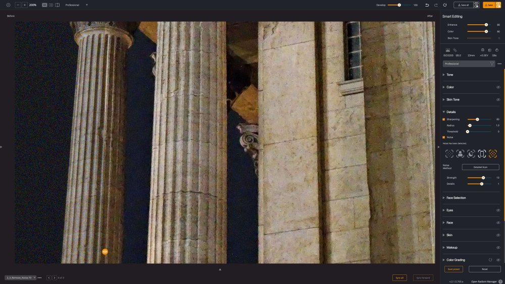 To fully understand your options, click the Detailed Scan button. This analyzes your image and suggests the best method (Night, Phone/High-ISO, Portrait, etc.). Even a Strength of 0 applies a baseline improvement, and Detail lets you balance smoothness and texture. If you regularly deal with extreme noise, dedicated tools still have a place; for most images, Radiant’s Noise Reduction is fast, natural, and integrated.