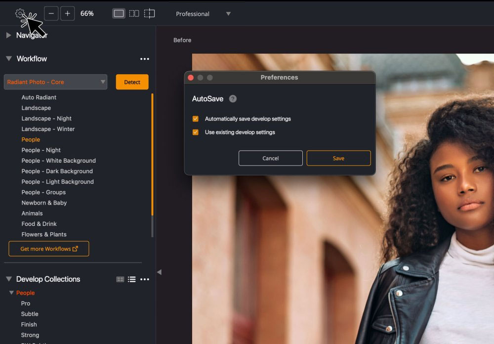 Click the gear icon to open the Settings controls. Here, you can control how AutoSave creates project sidecar files. These tiny files contain the settings for each image and are usually stored next to the original file on the disk.